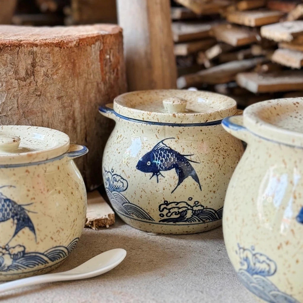 Hũ có thiết kế cổ điển với hình ảnh cá chép xanh được vẽ tay tinh xảo trên nền gốm vàng nhạt, tạo cảm giác truyền thống, mộc mạc.